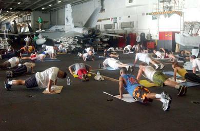 Keywords: US Navy 030317-N-9403F-001 Sailors participate in a workout led by the ship^rsquo,s Explosive Ordnance Disposal (EOD) team in the hanger bay aboard the aircraft carrier USS Abraham Lincoln (CVN 72).jpg en The Arabian Gulf Mar 17 2003 -- Sailors participate in a workout led by the ship s Explosive Ordnance Disposal EOD team in the hanger bay aboard the aircraft carrier USS Abraham Lincoln CVN 72 While anyone aboard is invited to attend the one-hour exercise strengthens and conditions Sailors for the demanding physical requirements of the EOD Lincoln and Carrier Air Wing Fourteen CVW 14 are conducting combat operations in support of Operation Southern Watch U S Navy photo by Photographer's Mate Airman Jason Frost RELEASED 2003-03-17 030317-N-9403F-001 Navy http //www navy mil/view_image asp id 5310 U S Navy photo by Photographer's Mate Airman Jason Frost PD-USGov-Military-Navy Aboard USS Abraham Lincoln CVN-72 Sailors from the United States Navy Physical exercises |