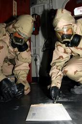 Keywords: US Navy 030323-N-9403F-045 Hull Technician Fireman Michael L. McLain assists Damage Controlman 3rd Class Joseph Pierce during a Chemical, Biological, and Radiological (CBR) drill aboard USS Abraham Lincoln (CVN 72).jpg en The Arabian Gulf Mar 23 2003 -- Hull Technician Fireman Michael L McLain assists Damage Controlman 3rd Class Joseph Pierce during a Chemical Biological and Radiological CBR drill aboard USS Abraham Lincoln CVN 72 in sampling a suspiscious substance 'found in the mail' using a bio-hazard sampling kit Lincoln is deployed in support of Operation Iraqi Freedom the multi-national coalition effort to liberate the Iraqi people eliminate Iraq's weapons of mass destruction and end the regime of Saddam Hussein U S Navy photo by Photographer's Mate Airman Jason Frost RELEASED 2003-03-23 030323-N-9403F-045 Navy http //www navy mil/view_image asp id 5633 U S Navy photo by Photographer's Mate Airman Jason Frost PD-USGov-Military-Navy Damage Controlman Aboard USS Abraham Lincoln CVN-72 |