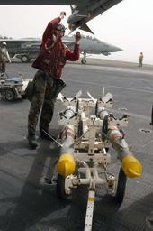 | Keywords: US Navy 030327-N-6817C-017 An Aviation Ordnanceman inspects an AIM-9 Sidewinder air-to-air missile on an F-A-18C Hornet on the flight deck aboard USS Abraham Lincoln (CVN 72).jpg en The Arabian Gulf Mar 27 2003 -- An Aviation Ordnanceman inspects an AIM-9 Sidewinder air-to-air missile on an F/A-18C Hornet on the flight deck aboard USS Abraham Lincoln CVN 72 Lincoln and Carrier Air Wing Fourteen CVW-14 are deployed to the Arabian Gulf in support of Operation Iraqi Freedom the multi-national coalition effort to liberate the Iraqi people eliminate Iraq s weapons of mass destruction and end the regime of Saddam Hussein U S Navy photo by Photographer's Mate 3rd Class Tyler J Clements RELEASED 2003-03-27 030327-N-6817C-017 Navy http //www navy mil/view_image asp id 5859 U S Navy photo by Photographer's Mate 3rd Class Tyler J Clements PD-USGov-Military-Navy AIM-9 Sidewinder Aviation Ordnanceman Aboard USS Abraham Lincoln CVN-72 |