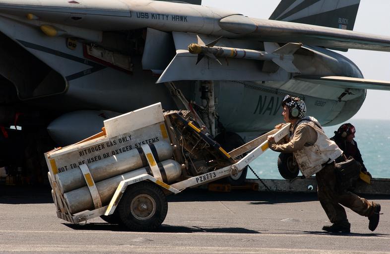Keywords: US Navy 030328-N-1810F-005 A Sailor assigned to Carrier Air Wing Five (CVW-5) liquid oxygen (LOX) division transports a nitrogen cart to a Carrier Air Wing Five (CVW-5) aircraft on the flight deck aboard the aircraft carrier US.jpg en The Arabian Gulf Mar 28 2003 -- A Sailor assigned to Carrier Air Wing Five CVW-5 liquid oxygen LOX division transports a nitrogen cart to a Carrier Air Wing Five CVW-5 aircraft on the flight deck aboard the aircraft carrier USS Kitty Hawk CV 63 for servicing Kitty Hawk and CVW-5 are currently deployed with coalition forces in support of Operation Iraqi Freedom the multi-national coalition effort to liberate the Iraqi people eliminate Iraq s weapons of mass destruction and end the regime of Saddam Hussein U S Navy photo by Photographer s Mate 3rd Class Todd Frantom RELEASED 2003-03-28 030328-N-1810F-005 Navy http //www navy mil/view_image asp id 6060 U S Navy photo by Photographer s Mate 3rd Class Todd Frantom PD-USGov-Military-Navy F-14A Tomcat on flight decks Fighter Squadron 154 United States Navy Flight deck of USS Kitty Hawk CV-63 AIM-9 Sidewinder Pictures by Mass Communication Specialist Todd Frantom |