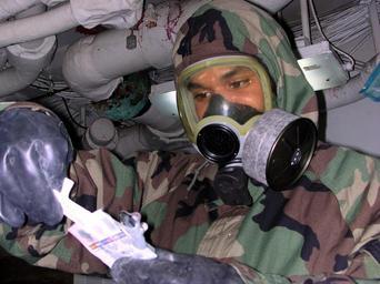 | Keywords: US Navy 030405-N-8935H-003 Electronics Technician 3rd Class Jimmy Reid from Gary, Ind., tests M-256 chemical detection paper during a simulated chemical air attack during a General Quarters (GQ) drill aboard the amphibious comm.jpg en South China Sea Apr 5 2003 -- Electronics Technician 3rd Class Jimmy Reid from Gary Ind tests M-256 chemical detection paper during a simulated chemical air attack during a General Quarters GQ drill aboard the amphibious command ship USS Blue Ridge LCC 19 Blue Ridge is operating in support of Operation Enduring Freedom U S Navy photo by Photographer s Mate 2nd Class Edward L Holland RELEASED 2003-04-05 030405-N-8935H-003 Navy http //www navy mil/view_image asp id 6418 U S Navy photo by Photographer s Mate 2nd Class Edward L Holland PD-USGov-Military-Navy Aboard USS Blue Ridge LCC-19 M256 Chemical Agent Detector Kit Males wearing gas masks MCU-2/P Protective Mask United States Navy training |