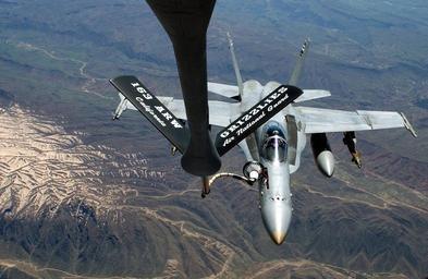 Keywords: US Navy 030411-N-0780F-089 An F-A-18 Hornet strike fighter embarked aboard USS Harry S. Truman (CVN 75) receives fuel from an Air National Guard Boeing KC-135 Stratotanker.jpg en Northern Iraq Apr 11 2003 -- An F/A-18 Hornet strike fighter embarked aboard USS Harry S Truman CVN 75 receives fuel from an Air National Guard Boeing KC-135 Stratotanker during a combat mission in direct support of Operation Iraqi Freedom The Stratotanker assigned to the 163rd Air Refueling Wing March Air Reserve Base Calif is forward deployed to a European operating base Truman and her embarked Carrier Air Wing Three CVW-3 are conducting combat missions in support of Operation Iraqi Freedom Operation Iraqi Freedom is the multi-national coalition effort to liberate the Iraqi people eliminate Iraq's weapons of mass destruction and end the regime of Saddam Hussein U S Navy photo by Paul Farley RELEASED 2003-04-11 030411-N-0780F-089 Navy http //www navy mil/view_image asp id 6720 U S Navy photo by Paul Farley PD-USGov-Military-Navy United States Navy in the Iraq War Military aircraft in the Iraq War Aerial refueling of F/A-18 Hornet Aerial refueling by KC-135 Stratotanker as seen from tanker 163d Reconnaissance Wing California Air National Guard |