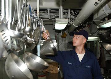 Keywords: US Navy 030412-N-2160C-002 Mess Management Specialist Seaman Cliff Barnes from Miami, Fla. grabs a filter off the utensils rack in the Chief Petty Officers Galley.jpg en The Gulf of Aden Apr 12 2003 -- Mess Management Specialist Seaman Cliff Barnes from Miami Fla grabs a filter off the utensils rack in the Chief Petty Officers Galley aboard USS Mount Whitney LCC/JCC 20 Mount Whitney and her embarked staff are deployed to the Horn of Africa region participating in Operation Enduring Freedom and the global war on terrorism U S Navy photo by Photographer s Mate 2nd Class Steven G Crawford RELEASED 2003-04-12 030412-N-2160C-002 Navy http //www navy mil/view_image asp id 6834 U S Navy photo by Photographer s Mate 2nd Class Steven G Crawford PD-USGov-Military-Navy Aboard USS Mount Whitney LCC-20 |