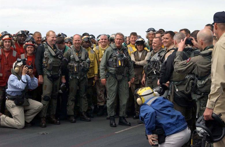 | Keywords: US Navy 030501-N-8479H-020 President George W. Bush greets sailors on the flight deck after a successful trap aboard the USS Abraham Lincoln (CVN 72).jpg en Pacific Ocean May 1 2003 -- President George W Bush greets sailors on the flight deck after a successful trap aboard the USS Abraham Lincoln CVN 72 in a S-3B Viking assigned to the Blue Wolves of Sea Control Squadron Three Five VS-35 designated NAVY 1 President Bush is the first sitting President to trap aboard an aircraft carrier at sea The President is conducting a visit aboard ship to meet with the Sailors and will address the Nation as Lincoln prepares to return from a 10-month deployment to the Arabian Gulf in support of Operation Iraqi Freedom U S Navy photo by Photographer's Mate 3rd Class Lewis Hunsaker RELEASED 2003-05-01 030501-N-8479H-020 Navy http //www navy mil/view_image asp id 7196 U S Navy photo by Photographer's Mate 3rd Class Lewis Hunsaker PD-USGov-Military-Navy Aboard USS Abraham Lincoln CVN-72 |