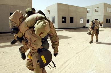 Keywords: US Navy 030520-N-4309A-046 Members of Naval Support Activity (NSA) Bahrain's Emergency Response Team participate in an improvised carry.jpg en Naval Support Activity NSA Bahrain May 20 2003 -- Members of Naval Support Activity NSA Bahrain's Emergency Response Team participate in an improvised carry which is one of the various ways of evacuating wounded personnel The NSA Bahrain Emergency Response Team recently met at a remote training facility to practice their skills on Chemical Biological Radiological defense response and recovery procedures U S Navy photo by Photographer s Mate 1st Class Aaron Ansarov RELEASED 030520-N-4309A-046 Navy http //www navy mil/view_image asp id 7627 U S Navy photo by Photographer s Mate 1st Class Aaron Ansarov PD-USGov-Military-Navy Naval Support Activity Bahrain Military protective clothing Military training in the United States Fireman's carry MCU-2/P Protective Mask Males wearing gas masks
