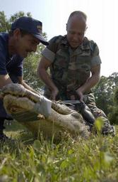 Keywords: US Navy 030530-N-5862D-187 Chief Aviation Boatswain's Mate Rodger Wisdom and Fireman Jonathan Sirmon wrangle a ten-foot alligator.jpg en King's Bay Ga May 29 2003 -- Chief Aviation Boatswain's Mate Rodger Wisdom and Fireman Jonathan Sirmon wrangle a ten-foot alligator aboard Naval Submarine Base King's Bay Chief Wisdom is the base Game Warden and is responsible for the capture of wildlife that could present a danger to base personnel Alligators that reach 6 feet or larger are considered too dangerous for base personnel and their families and are removed The smaller ones generally don't represent a threat to base personnel or dependents unless they are cornered or harassed The captured alligators are released along the North River which is a remote area where they can live away from the base U S Navy photo by Chief Photographer's Mate Chris Desmond RELEASED 2003-05-29 030530-N-5862D-187 Navy http //www navy mil/view_image asp id 7772 U S Navy photo by Chief Photographer's Mate Chris Desmond PD-USGov-Military-Navy Military in Georgia U S state Aviation Boatswain's Mates |