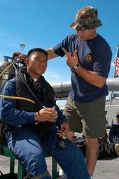 | Keywords: US Navy 030626-N-0493B-005 Operations Specialist 2nd Class Matthew Medeiros goes through pre-dive checks.jpg en Muara Brunei Darussalam June 26 2003 -- Operations Specialist 2nd Class Matthew Medeiros a diver assigned to the salvage ship USS Safeguard ARS 50 goes through pre-dive checks with Royal Brunei Navy RBN diver Cpl Heidi The training dive was the culmination of a day of training where Safeguard divers introduced the RBN divers to U S Navy techniques and procedures The training was part of the weeklong Brunei phase of exercise Cooperation Afloat Readiness and Training CARAT CARAT is a regularly scheduled series of bilateral military training exercises between the U S and several Association of Southeast Asian Nations ASEAN Safeguard is forward deployed to Sasebo Japan U S Navy photo by Lt Chuck Bell RELEASED 2003-06-26 030626-N-0493B-005 Navy http //www navy mil/view_image asp id 8261 U S Navy photo by Lt Chuck Bell PD-USGov-Military-Navy Images from US Navy location Muara Brunei Operations Specialist United States Navy |
