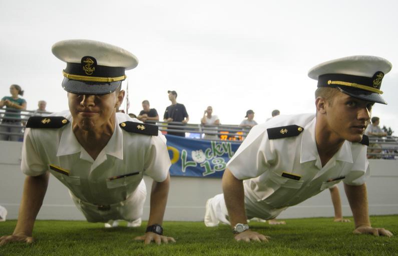Keywords: US Navy 030830-N-9693M-006 U.S. Naval Academy Midshipmen (Mid'n) do push-ups following a touchdown during Navy's football season opener against Virginia Military Institute (VMI).jpg en Annapolis Md Aug 30 2003 -- U S Naval Academy Midshipmen Mid'n do push-ups following a touchdown during Navy's football season opener against Virginia Military Institute VMI First year Mids must do a push-up for every point scored The Mids outscored the Keydets 37-10 and outgained VMI 598-296 The win snapped a 14-game home losing streak dating back to the 1999 season in the recently renovated Jack Stephens Field at Navy-Marine Corps Stadium U S Navy photo by Photographer's Mate 2nd Class Damon J Moritz RELEASED 2003-08-30 030830-N-9693M-006 Navy http //www navy mil/view_image asp id 9306 U S Navy photo by Photographer's Mate 2nd Class Damon J Moritz PD-USGov-Military-Navy Push-ups U S Naval Academy Midshipmen vs Virginia Military Institute Aug 30 2003 |
