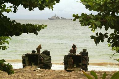 Keywords: US Navy 030918-N-0401E-007 Amphibious Assault Vehicles (AAV) wait to transport personnel.jpg en Luzon Philippines Sept 18 2003 -- USS Harpers Ferry LSD 49 cruises off the coast of the Philippines as Amphibious Assault Vehicles AAV wait to transport personnel and equipment back to the ship AAV's move from ship to shore capable of 8 to 10 knots in the water and over 45 mph on land carrying either personnel or support equipment in addition to having a 50-caliber machine gun and a grenade launcher for armament Harpers Ferry is part of USS Essex LHD 2 Amphibious Readiness Group with the embarked 31st Marine Expeditionary Unit is participating in Blue/Green Workups Blue/Green Workups is a bi-annual joint training exercise designed to develop joint cooperation and meld the blue/green team into one cohesive fighting force while operating with their Filippino counterparts U S Navy photo by Journalist 2nd Class Wes Eplen RELEASED 2003-09-18 030918-N-0401E-007 Navy http //www navy mil/view_image asp id 9663 U S Navy photo by Journalist 2nd Class Wes Eplen PD-USGov-Military-Navy Images from US Navy location Luzon Philippines Amphibious Assault Vehicle Aboard USS Harpers Ferry LSD-49 |