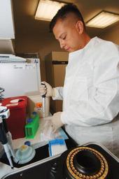 | Keywords: US Navy 030919-N-5821W-001 technician for Navy Environmental and Preventive Medicine Unit.jpg en Naval Air Station Sigonella Sicily Sept 19 2003 -- Hospital Corpsman 2nd Class Christopher Bray an advanced medical laboratory technician for Navy Environmental and Preventive Medicine Unit Seven NEPMU 7 prepares pipette solutions for use with the ruggedized advanced pathogenic identification device RAPID The RAPID is a portable device that uses a rapid diagnostic technology called polymerase chain reaction PCR to identify biological agents in under 30 minutes NAS Sigonella provides logistical support for Sixth Fleet and NATO forces in the Mediterranean Sea U S Navy photo by Journalist Seaman Stephen P Weaver RELEASED 2003-09-19 030919-N-5821W-001 Navy http //www navy mil/view_image asp id 9667 U S Navy photo by Journalist Seaman Stephen P Weaver PD-USGov-Military-Navy Naval Air Station Sigonella |