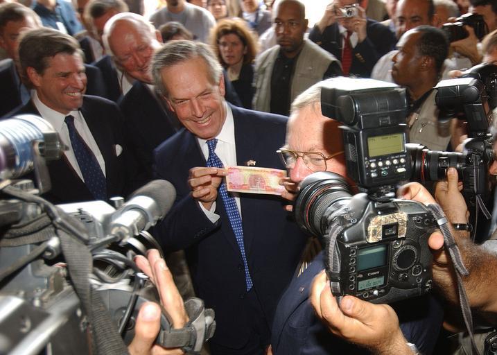 Keywords: US Navy 031015-N-4374S-007 U.S. Secretary of Commerce Don Evans displays a new Iraqi diner during a press conference.jpg en Baghdad Iraq Oct 15 2003 -- U S Secretary of Commerce Don Evans displays a new Iraqi dinar during a press conference Secretary Evans met with Iraqi leaders to talk about the progress of the economy in Iraq during his visit to Baghdad U S Navy photo by Photographer s Mate 2nd Class Michael Sandberg RELEASED 2003-10-15 031015-N-4374S-007 Navy http //www navy mil/view_image asp id 10054 U S Navy photo by Photographer s Mate 2nd Class Michael Sandberg PD-USGov-Military-Navy Baghdad in the Iraq War |