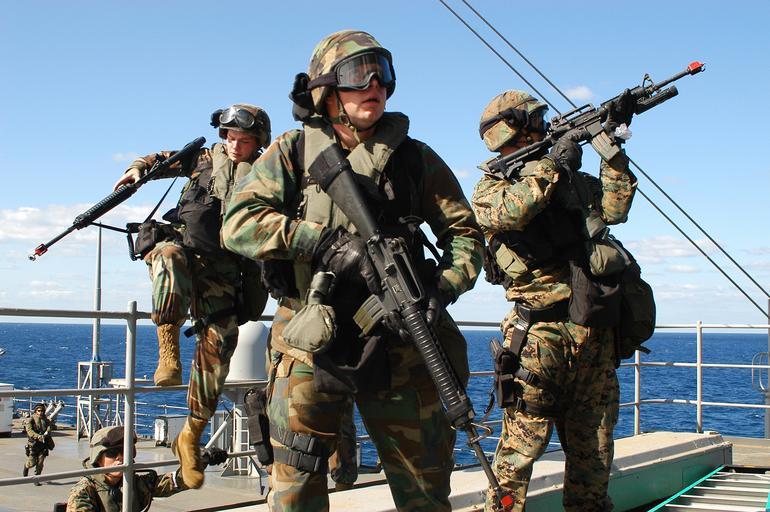 Keywords: US Navy 031025-N-4055P-006 A Visit, Board, Search and Seizure (VBSS) training scenario aboard USS Blue Ridge (LCC 19).jpg en Aboard USS Blue Ridge LCC 19 Oct 25 2003 -- Lance Cpl Paul Cory from Lakeside Ore right provides cover for Lance Cpl Levi Peck from Chippewa Falls Wis center and Lance Cpl Jeremy Baker from Mesa Ariz left as they climb over the railing and move into position during a Visit Board Search and Seizure VBSS training scenario aboard USS Blue Ridge LCC 19 Blue Ridge is under way for a regularly scheduled deployment U S Navy photo by Photographer's Mate 1st Class Winston C Pitman RELEASED 2003-10-25 031025-N-4055P-006 Navy http //www navy mil/view_image asp id 10247 U S Navy photo by Photographer's Mate 1st Class Winston C Pitman PD-USGov-Military-Navy Aboard USS Blue Ridge LCC-19 M16 rifle with blank-firing adaptor M4 carbine with blank-firing adaptor Visit Board Search and Seizure |