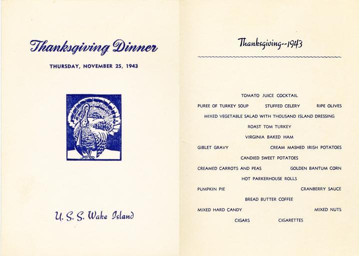 Keywords: US Navy 031125-N-0336C-001 Holiday dinners on ship and shore are important memories for past and present Sailors of special times away from home with their shipmates.jpg en Naval Historical Center Washington D C File photo Holiday dinners on ship and shore are important memories for past and present Sailors of special times away from home with their shipmates The Navy Department Library has more than 100 historic holiday menus in its collection and an exhibit of some them is in its reference section One on exhibit is this 1943 Thanksgiving Day dinner menu from USS Wake Island CVE 65 The library is trying to collect holiday menus from all eras including the present day U S Navy photo RELEASED 031125-N-0336C-001 Navy http //www navy mil/view_image asp id 10768 U S Navy photo PD-USGov-Military-Navy Food menus in English USS Wake Island CVE-65 Thanksgiving menu 1943 in the United States World War II in 1943