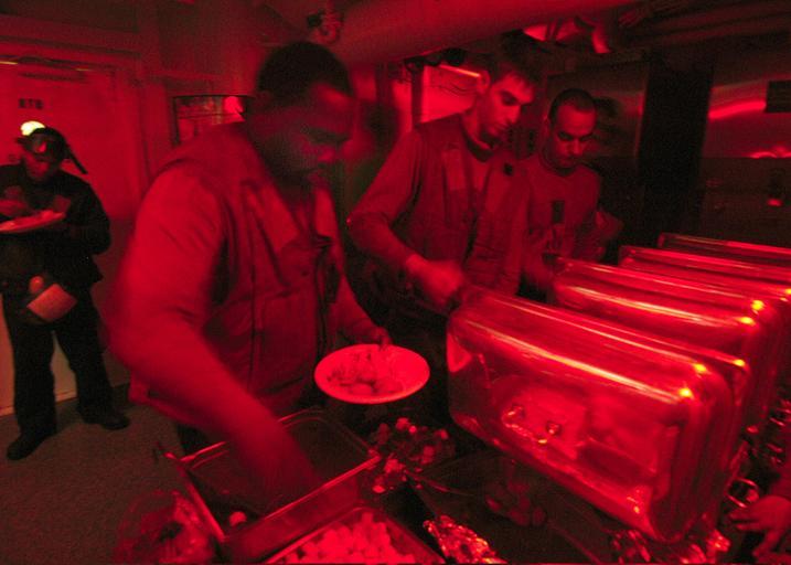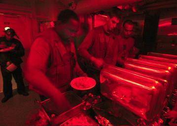 Keywords: US Navy 031127-N-9742R-001 Flight deck personnel help themselves to a Thanksgiving dinner aboard USS Enterprise.jpg en Arabian Gulf Nov 27 2003 -- Flight deck personnel help themselves to a Thanksgiving dinner aboard USS Enterprise CVN 65 served by Mess Management Specialists under dim red lights within the aircraft carrier's island superstructure During night flight operations red lights help conserve the night vision of flight deck personnel U S Navy photo by Photographer's Mate Airman Milosz Reterski RELEASED 2003-11-27 031127-N-9742R-001 Navy http //www navy mil/view_image asp id 10848 U S Navy photo by Photographer's Mate Airman Milosz Reterski PD-USGov-Military-Navy Aboard USS Enterprise CVN-65 Thanksgiving food Red Military activities at night Thanksgiving in the Military of the United States Thanksgiving 2003 November 2003 2003 in water transport People of the United States in 2003 Photographs taken on 2003-11-27 Thanksgiving onboard watercraft |