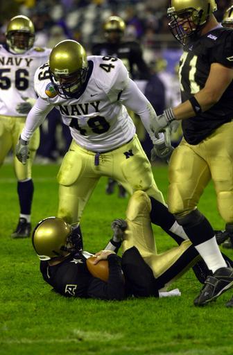 Keywords: US Navy 031206-N-9693M-031 Navy linebacker Jeremy Chase stands over Army quarterback Zac Dahman after a sack during the 104th playing of the Army Navy game.jpg en Philadelphia Pa Dec 6 2003 -- Navy linebacker Jeremy Chase stands over Army quarterback Zac Dahman after a sack during the 104th playing of the Army Navy game Navy triumphed over Army 34-6 at Lincoln Financial Field Philadelphia Pa The Midshipmen will next play in the EV1 net Houston Bowl on Dec 30 U S Navy photo by Damon J Moritz RELEASED 2003-12-06 031206-N-9693M-031 Navy http //www navy mil/view_image asp id 10905 U S Navy photo by Damon J Moritz PD-USGov-Military-Navy 2003 Army-Navy Game |
