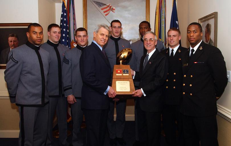 Keywords: US Navy 040122-N-2568S-001 Cadets from the U.S. Military Academy West Point, and Midshipmen from the U.S. Naval Academy join Secretary of the Navy, the Honorable Gordon R. England.jpg en Cadets from the U S Military Academy West Point and Midshipmen from the U S Naval Academy join Secretary of the Navy the Honorable Gordon R England and Acting Secretary of the Army the Honorable Les Brownlee for a group photo with the Secretary's Trophy awarded to the U S Navy Football Team following their winning 8-5 season U S Navy photo by Chief Journalist Craig P Strawser 2004-01-22 040122-N-2568S-001 Navy http //www navy mil/view_image asp id 11635 U S Navy photo by Chief Journalist Craig P Strawser PD-USGov-Military-Navy Les Brownlee Army Black Knights football Gordon R England Navy Midshipmen football players People receiving trophies or awards Secretary's Trophy |