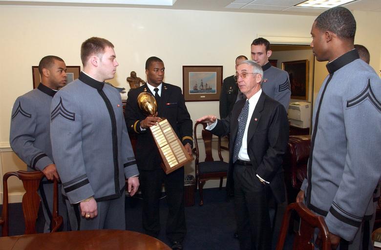 Keywords: US Navy 040122-N-2568S-002 Cadets from the U.S. Military Academy West Point, and Midshipmen from the U.S. Naval Academy meet with the Secretary of the Navy, the Honorable Gordon R. England during the official presentation of th.jpg en Cadets from the U S Military Academy West Point and Midshipmen from the U S Naval Academy meet with the Secretary of the Navy the Honorable Gordon R England during the official presentation of the Secretary's Trophy awarded to the U S Navy Football Team following their winning 8-5 season U S Navy photo by Chief Journalist Craig P Strawser 2004-01-22 040122-N-2568S-002 Navy http //www navy mil/view_image asp id 11636 U S Navy photo by Chief Journalist Craig P Strawser PD-USGov-Military-Navy Navy Midshipmen football players Gordon R England Secretary's Trophy People receiving trophies or awards Army Black Knights football |