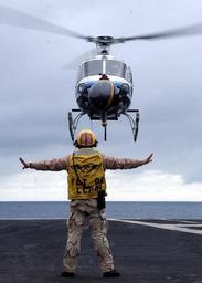| Keywords: US Navy 040128-N-3241H-018 Chief Aviation Boatswain's Mate Glenn Harrison guides a commercial aerial filming helicopter safely to the flight deck aboard USS Carl Vinson (CVN 70).jpg en Pacific Ocean Jan 28 2004 - Chief Aviation Boatswain's Mate Glenn Harrison guides a commercial aerial filming helicopter safely to the flight deck aboard USS Carl Vinson CVN 70 The helicopter will be used during filming of the upcoming motion picture Stealth The Bremerton Washington based aircraft carrier is currently underway for the first time since returning from an eight and half month Western Pacific deployment Carl Vinson is conducting training with Carrier Air Wing Nine CVW-9 and other units assigned to the Carl Vinson Carrier Strike Group CSG U S Navy photo by Photographer's Mate Third Class Dustin Howell RELEASED 2004-01-28 040128-N-3241H-018 Navy http //www navy mil/view_image asp id 11642 U S Navy photo by Photographer's Mate Third Class Dustin Howell PD-USGov-Military-Navy Aviation Boatswain's Mates Handlers Aboard USS Carl Vinson CVN-70 |