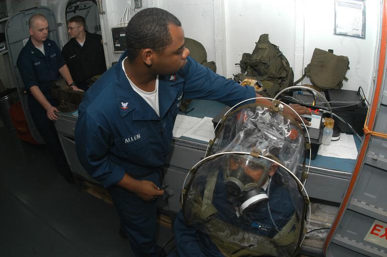 Keywords: US Navy 040128-N-8955H-002 Damage Controlman 3rd Class James Allen from Oakland, Calif., conducts a MCU-2P Gas Mask fit test using a TDA 99M respirator functional testing system on Disbursing Clerk Seaman Recruit Aidan Lee.jpg en Philippine Sea Jan 28 2004 - Damage Controlman 3rd Class James Allen from Oakland Calif conducts a MCU/2P Gas Mask fit test using a TDA 99M respirator functional testing system on Disbursing Clerk Seaman Recruit Aidan Lee from Shiprock N M in the Damage Control shop aboard USS Blue Ridge LCC 19 The respirator tester is used to check the sailor's gas mask for the correct fit and seal U S Navy photo by Photographer's Mate 1st Class Novia E Harrington RELEASED 2004-01-28 040128-N-8955H-002 Navy http //www navy mil/view_image asp id 11644 U S Navy photo by Photographer's Mate 1st Class Novia E Harrington PD-USGov-Military-Navy Damage Controlman Aboard USS Blue Ridge LCC-19 Disbursing Clerk MCU-2/P Protective Mask |
