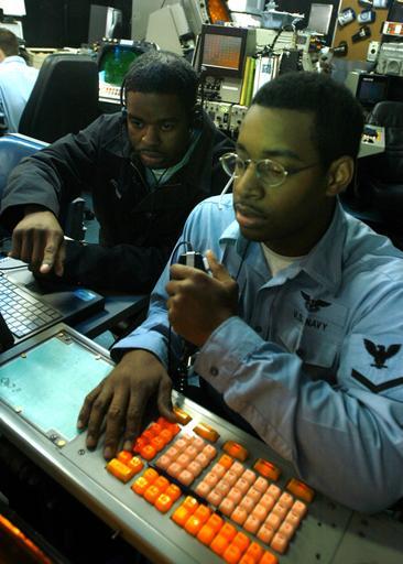 | Keywords: US Navy 040129-N-7278A-002 Air Traffic Controller 3rd Class Alec Granderson from Chicago, Ill., and Air Traffic Controller 2nd Class Courtney K. Pittman from Memphis, Tenn., keep a watchful eye on their radar screens.jpg en Red Sea Jan 29 2004 Air Traffic Controller 3rd Class Alec Granderson from Chicago Ill and Air Traffic Controller 2nd Class Courtney K Pittman from Memphis Tenn keep a watchful eye on their radar screens in the ship s Carrier Air Traffic Control Center CATCC aboard USS Enterprise CVN 65 The personnel assigned to the CATCC monitor and direct aircraft within 50 numerical miles of the nuclear-powered aircraft carrier U S Navy photo by Photographer's Mate Airman Lucious P Alexander Jr RELEASED 2004-01-29 040129-N-7278A-002 Navy http //www navy mil/view_image asp id 11726 U S Navy photo by Photographer's Mate Airman Lucious P Alexander Jr PD-USGov-Military-Navy Carrier Air Traffic Control Center Aboard USS Enterprise CVN-65 Air Traffic Controller United States Navy |