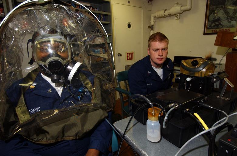 Keywords: US Navy 040202-N-9288T-045 Fire Controlman 1st Class Ritchie Andrews, of Laurelton, N.Y., has a fit test performed on his MCU-2-P gas mask while Damage Controlman 3rd Class Travis Ross, from Delavan, Wis., monitors the readings.jpg en Aboard USS Vincennes CG 49 Feb 2 2004 Fire Controlman 1st Class Ritchie Andrews of Laurelton N Y has a fit test performed on his MCU-2/P gas mask while Damage Controlman 3rd Class Travis Ross from Delavan Wis monitors the readings on the TDA-99M respirator tester aboard the guided missile cruiser USS Vincennes CG 49 The tester emits a mineral oil vapor thru the drinking tube on the gas mask and detects if any vapor is present in the plastic containment indicating an improper seal from the gas mask Vincennes is participating in Multi-Sail a combat readiness exercise in the Okinawa operational area U S Navy photo by Photographer s Mate 2nd Class Brandon A Teeples RELEASED 2004-02-02 040202-N-9288T-045 Navy http //www navy mil/view_image asp id 11738 U S Navy photo by Photographer s Mate 2nd Class Brandon A Teeples PD-USGov-Military-Navy Aboard USS Vincennes CG-49 Fire Controlman Damage Controlman MCU-2/P Protective Mask |