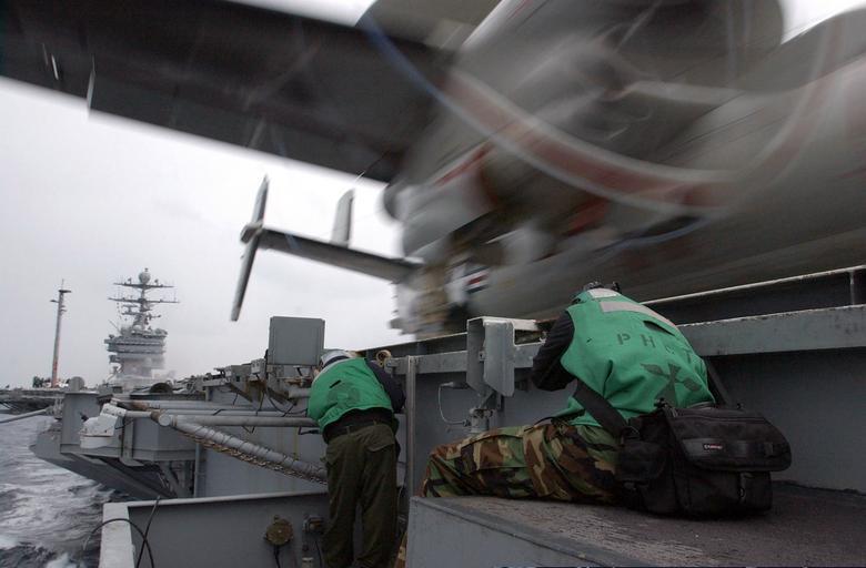 Keywords: US Navy 040224-N-4308O-055 Photographer's Mate Airman Criag Spiering photographs an E-2C Hawkeye assigned to the ^ldquo,Bear Aces^rdquo, of Carrier Airborne Early Warning Squadron One Two Four (VAW-124), while the aircraft laun.jpg en Atlantic Ocean Feb 24 2004 Photographer's Mate Airman Craig Spiering photographs an E-2C Hawkeye assigned to the Bear Aces of Carrier Airborne Early Warning Squadron One Two Four VAW-124 while the aircraft launches from the flight deck aboard USS Harry S Truman CVN 75 The nuclear powered aircraft carrier Harry S Truman is undergoing carrier qualifications and flight deck certification off the Atlantic coast U S Navy photo by Photographer's Mate Airman Ryan O'Connor RELEASED 2004-02-24 040224-N-4308O-055 Navy http //www navy mil/view_image asp id 12262 U S Navy photo by Photographer's Mate Airman Ryan O'Connor PD-USGov-Military-Navy Aboard USS Harry S Truman CVN-75 Photographers Mate Northrop Grumman E-2C Hawkeye aircraft carrier take-offs Airborne Early Warning Squadron 124 United States Navy |