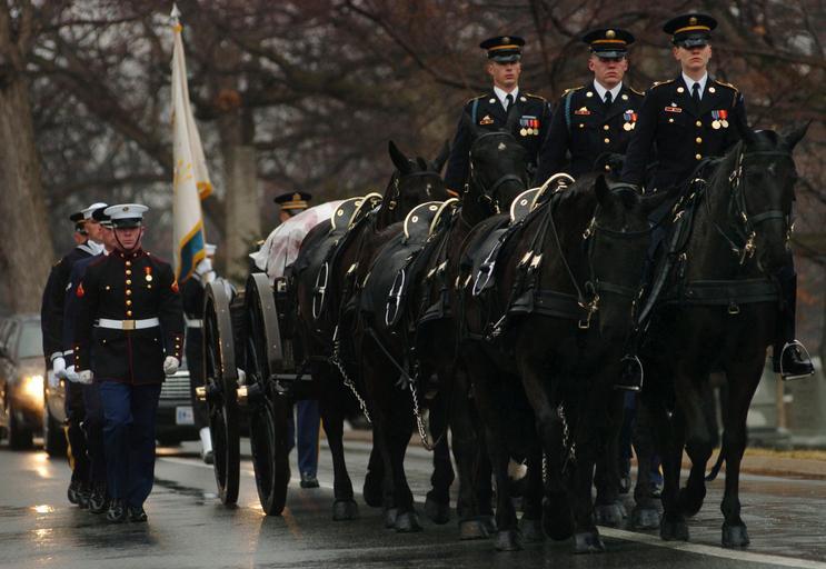 Keywords: US Navy 040224-N-6213R-008 Members of the U.S. Army^rsquo,s 3rd Infantry Old Guard caisson platoon, parade the black flag draped casket of Adm. Thomas H. Moorer.jpg en Arlington Va Feb 20 2004 Members of the U S Army s 3rd Infantry Old Guard caisson platoon parade the black flag draped casket of Adm Thomas H Moorer during a full military honors burial at Arlington National Cemetery Adm Moorer is a graduate of the Naval Academy class of1933 and went on to served as the Chief of Naval Operations from 1967-1970 whereupon he was appointed Chairman of the Joint Chiefs of Staff a post he held until his retirement in 1974 A former naval aviator Moorer earned many medals and honors during his career including the Department of Defense Distinguished Service Medal and the Distinguished Flying Cross U S Navy photo by Photographer's Mate 3rd Class Mark J Rebilas RELEASED 2004-02-20 040224-N-6213R-008 Navy http //www navy mil/view_image asp id 12106 U S Navy photo by Photographer's Mate 3rd Class Mark J Rebilas PD-USGov-Military-Navy Arlington National Cemetery Thomas Hinman Moorer Funerals of military people in the United States Funeral processions in the United States Postillions Photographs by Mark J Rebilas |