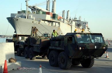 | Keywords: US Navy 040226-N-0743B-047 A U.S. Marine M-977 Heavy Expanded Mobility Tactical Truck (HEMTT) and other Marine vehicles are unloaded from the Military Sealift Command (MSC) fast sealift ship USNS Bellatrix (T-AKR 288) at the po.jpg en Mina Ash-Shu'aibah Kuwait Feb 26 2004 A U S Marine M-977 Heavy Expanded Mobility Tactical Truck HEMTT and other Marine vehicles are unloaded from the Military Sealift Command MSC fast sealift ship USNS Bellatrix T-AKR 288 at the port of Mina Ash-Shu'aibah Kuwait in support of the recent troop rotations in Iraq MSC is the transportation provider for the Department of Defense with the responsibility of providing strategic sealift and ocean transportation for all military forces overseas U S Navy photo by Journalist 3rd Class Eric L Beauregard RELEASED 2004-02-26 040226-N-0743B-047 Navy http //www navy mil/view_image asp id 12884 U S Navy photo by Journalist 3rd Class Eric L Beauregard PD-USGov-Military-Navy United States Navy in Ash Shuaybah Kuwait USNS Bellatrix T-AKR-288 HEMTT M977 Cargo |