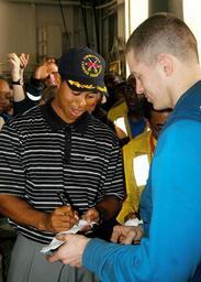 | Keywords: US Navy 040303-N-7340V-032 Professional Golfer Tiger Woods signs autographs for the crew after a golf ball driving demonstration aboard the nuclear powered aircraft carrier USS George Washington (CVN 73).jpg en Arabian Gulf March 3 2004 Professional Golfer Tiger Woods signs autographs for the crew after a golf ball driving demonstration aboard the nuclear powered aircraft carrier USS George Washington CVN 73 Tiger Woods accompanied by his fiancé Elin Nordegren PGA player Mark O Meara and caddies Steve Williams and Greg Rita visited the Norfolk Va Based carrier in the Arabian Gulf before participating in the European PGA Tour s Dubai Desert Classic on Thursday The George Washington Carrier Strike Group CSG and Carrier Air Wing Seven CVW-7 are deployed to the Arabian Gulf in support of Operations Iraqi and Enduring Freedom U S Navy photo by Photographer's Mate 1st Class James Vidrine RELEASED 2004-03-03 040303-N-7340V-032 Navy http //www navy mil/view_image asp id 12371 U S Navy photo by Photographer's Mate 1st Class James Vidrine PD-USGov-Military-Navy Aboard USS George Washington CVN-73 Sportspeople giving autographs Tiger Woods in 2004 |