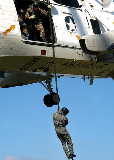 Keywords: US Navy 040408-N-8921O-012 Aircrew Survival Equipmentman 2nd Class John Mann, of San Diego, Calif., fast ropes out of a UH-3H Sea King helicopter.jpg en Oak Harbor Wash Apr 08 2004 - Aircrew Survival Equipmentman 2nd Class John Mann of San Diego Calif fast ropes out of a UH-3H Sea King helicopter Petty Officer Mann is assigned to Explosive Ordnance Disposal Mobile Unit Eleven EODMU-11 The unit is conducting fast rope and rappelling exercises to help prepare the team for combat situations U S Navy photo by Photographer's Mate Airman Chris Otsen RELEASED 2004-04-08 040408-N-8921O-012 Navy http //www navy mil/view_image asp id 13172 U S Navy photo by Photographer's Mate Airman Chris Otsen PD-USGov-Military-Navy Naval Air Station Whidbey Island United States Navy Explosive Ordnance Disposal Aircrew Survival Equipmentman Fast roping UH-3H Sea King Explosive Ordnance Disposal Mobile Unit 11 |