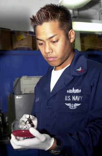 Keywords: US Navy 040421-N-7949W-003 Hospital Corpsman 2nd Class Patrick C. Mangaran from Beach Park, Ill, swabs a bacteria culture for further examination.jpg en At sea aboard the amphibious assault ship USS Tarawa LHA 1 Apr 21 2004 - Hospital Corpsman 2nd Class Patrick C Mangaran from Beach Park Ill swabs a bacteria culture for further examination Patrick is USS Tarawa's only medical laboratory technician and is responsible for all blood and culture tests preformed on board the ship Tarawa recently conducted a Command Assessment for Readiness and Training phase II CART II evolution off the coast of Southern California U S Navy photo by Photographer's Mate 1st Class Daniel Woods RELEASED 2004-04-21 040421-N-7949W-003 Navy http //www navy mil/view_image asp id 13718 U S Navy photo by Photographer's Mate 1st Class Daniel Woods PD-USGov-Military-Navy Aboard USS Tarawa LHA-1 Hospital Corpsman |