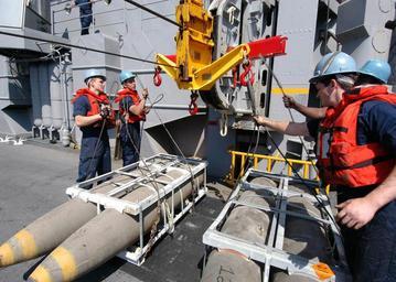 Keywords: US Navy 040423-N-4190W-011 Deck department personnel aboard the fast combat support ship USS Seattle (AOE 3) transport ammunition to USS John F. Kennedy (CV 67).jpg en Atlantic Ocean Apr 23 2004 - Deck department personnel aboard the fast combat support ship USS Seattle AOE 3 transport ammunition to USS John F Kennedy CV 67 during an underway replenishment Kennedy is making final preparations before deploying on a scheduled six-month deployment to the Mediterranean Sea U S Navy photo by Photographer's Mate 3rd Class Chris Weibull RELEASED 2004-04-23 040423-N-4190W-011 Navy http //www navy mil/view_image asp id 13615 U S Navy photo by Photographer's Mate 3rd Class Chris Weibull PD-USGov-Military-Navy Cargo in transfer underway replenishment Aboard USS John F Kennedy CV-67 |