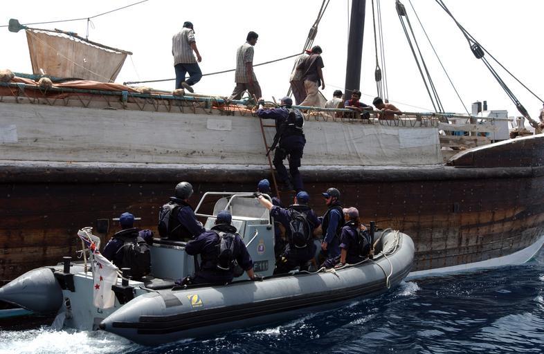 | Keywords: US Navy 040502-N-7586B-006 Boarding Team Members from New Zealand's HMNZS Te Mana (F 111) embark a local transport dhow, from a Rigid Hull Inflatable Boat (RHIB) while conducting a search of the vessel.jpg en Gulf of Oman May 2 2004 - Boarding Team Members from New Zealand's HMNZS Te Mana F 111 embark a local transport dhow from a Rigid Hull Inflatable Boat RHIB while conducting a search of the vessel Te Mana is one of two Anzac class frigates assigned to New Zealand's Naval Combat Forces The multinational Combined Task Force 150 CTF-150 was established to monitor inspect board and stop suspect shipping to pursue the war on terrorism and includes operations currently taking place in the North Arabia Sea to support Operation Iraqi Freedom Countries contributing to CTF-150 currently include Australia Canada France Germany Italy Pakistan New Zealand Spain United Kingdom and the United States U S Navy photo by Photographer's Mate 1st Class Bart Bauer RELEASED 2004-05-02 040502-N-7586B-006 Navy http //www navy mil/view_image asp id 13974 U S Navy photo by Photographer's Mate 1st Class Bart Bauer PD-USGov-Military-Navy Rigid-hulled inflatable boats People of the Royal New Zealand Navy Visit Board Search and Seizure Ladders HMNZS Te Mana F111 Wooden vessels in Gulf of Oman Combined Task Force 150 |