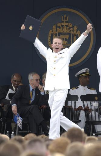 Keywords: US Navy 040528-N-9693M-017 A newly commissioned Ensign cheers to the crowd as he passes Secretary of the Navy, Gordon R. England during the U.S. Naval Academy class of 2004 graduation and commissioning ceremony.jpg en U S Naval Academy May 28 2004 - A newly commissioned Ensign cheers to the crowd as he passes Secretary of the Navy Gordon R England during the U S Naval Academy class of 2004 graduation and commissioning ceremony Nine hundred-ninety Midshipmen graduated from the U S Naval Academy and became commissioned officers in the U S Military Chairman of the Joint Chiefs of Staff Gen Richard B Myers delivered the commencement address and personally greeted each graduate during the ceremony The men and women of the graduating class were sworn into the Navy as Ensigns or into the Marine Corps as Second Lieutenants Six hundred sixty-one graduates chose to continue their career as Naval officers U S Navy photo by Photographer's Mate 2nd Class Damon J Moritz RELEASED 2004-05-28 040528-N-9693M-017 Navy http //www navy mil/view_image asp id 14487 U S Navy photo by Photographer's Mate 2nd Class Damon J Moritz PD-USGov-Military-Navy Graduation and Commissioning Ceremony May 28 2004 Taken with Nikon D1X