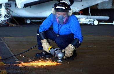 | Keywords: US Navy 040604-N-9319H-027 Airman Carmeia Wetchie, from Firth, Idaho, grinds non-skid from a weapons elevator door.jpg en South Atlantic Ocean June 4 2004 - Airman Carmeia Wetchie from Firth Idaho grinds non-skid from a weapons elevator door in the hangar bay aboard USS Ronald Reagan CVN 76 in preparation for resurfacing The aircraft carrier with embarked Carrier Air Wing One One CVW-11 is underway in the South Atlantic Ocean circumnavigating South America on her way to her new homeport of San Diego Calif U S Navy photo by Photographer's Mate 3rd Class Angel G Hilbrands RELEASED 2004-06-04 040604-N-9319H-027 Navy http //www navy mil/view_image asp id 14778 U S Navy photo by Photographer's Mate 3rd Class Angel G Hilbrands PD-USGov-Military-Navy Weapons elevators of USS Ronald Reagan CVN-76 Hangar bays of USS Ronald Reagan CVN-76 |