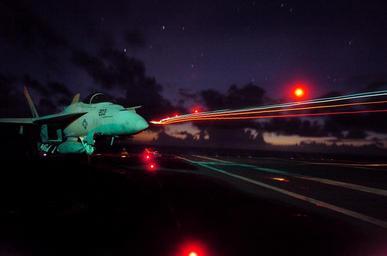 | Keywords: US Navy 040712-N-6213R-227 An F-A-18E Super Hornet assigned to the Eagles of Strike Fighter Squadron One One Five (VFA-115) sits chained to the flight deck as the lights of a incoming plane streak by during this fifteen second.jpg en Pacific Ocean July 12 2004 - An F/A-18E Super Hornet assigned to the Eagles of Strike Fighter Squadron One One Five VFA-115 sits chained to the flight deck as the lights of a incoming plane streak by during this fifteen second time exposure during night operations on the flight deck aboard the aircraft carrier USS John C Stennis CVN 74 The ship and Carrier Air Wing Fourteen CVW-14 are taking part in the multi-national maritime exercise Rim of the Pacific 2004 RIMPAC RIMPAC is the largest international maritime exercise in the waters around the Hawaiian Islands This year's exercise includes seven participating nations; Australia Canada Chile Japan South Korea United Kingdom and United States RIMPAC is intended to enhance the tactical proficiency of participating units in a wide array of combined operations at sea while enhancing stability in the Pacific Rim region U S Navy photo by Photographer's Mate 3rd Class Mark J Rebilas RELEASED For more information go to <a href http //www cpf navy mil/RIMPAC2004 Target _BLANK >www cpf navy mil/RIMPAC2004</a>/ 2004-07-12 040712-N-6213R-227 Navy http //www navy mil/view_image asp id 16171 U S Navy photo by Photographer's Mate 3rd Class Mark J Rebilas PD-USGov-Military-Navy Aboard USS John C Stennis CVN-74 F/A-18E Super Hornet on flight decks Aircraft carrier landings Aircraft light trails Military activities at night F/A-18 Hornet aircraft carrier launches Strike Fighter Squadron 115 United States Navy Photographs by Mark J Rebilas |