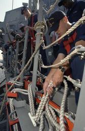 Keywords: US Navy 040715-N-5862D-244 Boatswain's Mate 3rd Class Ben Gozales from Salt Lake City, Utah, secures the pilots ladder on the port side of the ship while inport at Naval Station Pascagoula, Miss.jpg en Pascagoula Miss July 15 2004 - Boatswain's Mate 3rd Class Ben Gozales from Salt Lake City Utah secures the pilots ladder on the port side of the ship while inport at Naval Station Pascagoula Miss Gonzales is assigned to the deck department aboard the Navy's newest Arleigh Burke-class guided missile destroyer USS Chung-Hoon DDG 93 Chung-Hoon is making preparations to depart the Pascagoula shipyard and steam towards her new homeport in Pearl Harbor Hawaii where she will be officially commissioned later this year U S Navy photo by Chief Photographer's Mate Chris Desmond RELEASED 2004-07-15 040715-N-5862D-244 Navy http //www navy mil/view_image asp id 16534 U S Navy photo by Chief Photographer's Mate Chris Desmond PD-USGov-Military-Navy Aboard Chung-Hoon DDG-93 Naval Station Pascagoula |