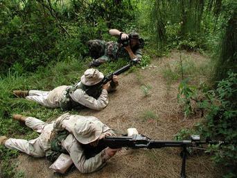 Keywords: US Navy 040715-N-5972N-008 U.S. Navy Photographer's Mate 2nd Class Richard Brunson, assigned to Fleet Combat Camera Group Pacific, documents Marines.jpg en Kahuku Training Area Oahu Hawaii July 15 2004 - U S Navy Photographer's Mate 2nd Class Richard Brunson assigned to Fleet Combat Camera Group Pacific documents Marines at the Kahuku Training Area on the island of Oahu Hawaii The Marines are assigned to the 3rd Marine Regiment Kaneohe Hawaii and are role-playing as opposition force OPFOR personnel in a training event in support of exercise Rim of the Pacific 2004 RIMPAC is the largest international maritime exercise in the waters around the Hawaiian Islands This year's exercise includes seven participating nations; Australia Canada Chile Japan South Korea the United Kingdom and the United States RIMPAC is intended to enhance the tactical proficiency of participating units in a wide array of combined operations at sea while enhancing stability in the Pacific Rim region U S Navy photo by Lt Cmdr Rick Naystatt RELEASED For more information go to <a href http //www cpf navy mil/RIMPAC2004 Target _BLANK >www cpf navy mil/RIMPAC2004</a>/ 2004-07-15 040715-N-5972N-008 Navy http //www navy mil/view_image asp id 16268 U S Navy photo by Lt Cmdr Rick Naystatt PD-USGov-Military-Navy Kahuku Training Area Oahu Photographers Mate People with cameras RIMPAC 2004 M16 rifle with Multiple Integrated Laser Engagement System M-240 machine gun Opposing forces of the United States Armed Forces