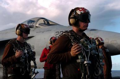 Keywords: US Navy 040718-N-6213R-004 Plane Captains assigned to the Eagles of Strike Fighter Squadron One One Five (VFA-115).jpg en Pacific Ocean July 18 2004 - Plane Captains assigned to the Eagles of Strike Fighter Squadron One One Five VFA-115 hold aircraft tie-down chains while they observe their assigned aircraft launch from the deck aboard USS John C Stennis CVN 74 The ship and Carrier Air Wing Fourteen CVW-14 are taking part in Rim of the Pacific RIMPAC 2004 RIMPAC is the largest international maritime exercise in the waters around the Hawaiian Islands This year's exercise includes seven participating nations; Australia Canada Chile Japan South Korea United Kingdom and United States RIMPAC is intended to enhance the tactical proficiency of participating units in a wide array of combined operations at sea while enhancing stability in the Pacific Rim region U S Navy photo by Photographer's Mate 3rd Class Mark J Rebilas RELEASED For more information go to <a href http //www cpf navy mil/RIMPAC2004 Target _BLANK >http //www cpf navy mil/RIMPAC2004</a>/ 2004-07-18 040718-N-6213R-004 Navy http //www navy mil/view_image asp id 16383 U S Navy photo by Photographer's Mate 3rd Class Mark J Rebilas PD-USGov-Military-Navy Aboard USS John C Stennis CVN-74 Aircraft tie-down chains Strike Fighter Squadron 115 United States Navy Photographs by Mark J Rebilas |