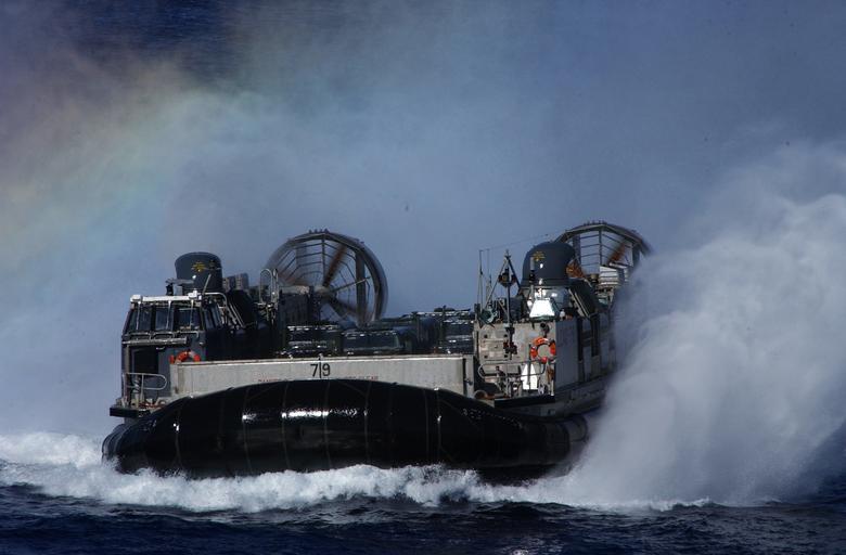 Keywords: US Navy 040719-N-8500S-024 A Landing Craft Air Cushion (LCAC), assigned to the Swift Intruders of Assault Craft Unit FIVE (ACU-5) operates off the coast of Hawaii during exercise Rim of the Pacific (RIMPAC) 2004.jpg en Pacific Ocean July 19 2004 - A Landing Craft Air Cushion LCAC assigned to the Swift Intruders of Assault Craft Unit FIVE ACU-5 operates off the coast of Hawaii during exercise Rim of the Pacific RIMPAC 2004 An LCAC is a high-speed over-the-beach fully amphibious landing craft capable of carrying a 60-75 ton payload transporting weapons equipment cargo and personnel of a Marine Air-Ground Task Force from ship to shore RIMPAC is the largest international maritime exercise in the waters around the Hawaiian Islands This years exercise includes seven participating nations; Australia Canada Chile Japan South Korea the United Kingdom and the United States RIMPAC is intended to enhance the tactical proficiency of participating units in a wide array of combined operations at sea while enhancing stability in the Pacific Rim region U S Navy photo by Photographer's Mate 3rd Class Paula J Sato RELEASED 2004-07-19 040719-N-8500S-024 Navy http //www navy mil/view_image asp id 16442 U S Navy photo by Photographer's Mate 3rd Class Paula J Sato PD-USGov-Military-Navy LCAC-79 ship 1995 Watercraft in motion |