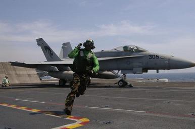 Keywords: US Navy 040720-N-5781F-010 Aviation Boatswain's Mate 3rd Class Johnson Kyemanie from Grenada, Miss., runs to the foul line signaling the all clear for launch of an F-A-18C Hornet off the flight deck of USS Kitty Hawk (CV 63).jpg en Pacific Ocean July 20 2004 - Aviation Boatswain's Mate 3rd Class Johnson Kyemanie from Grenada Miss runs to the foul line signaling the all clear for launch of an F/A-18C Hornet off the flight deck of USS Kitty Hawk CV 63 Kitty Hawk is one of seven carrier strike groups CSGs involved in Summer Pulse 2004 Summer Pulse 2004 is the simultaneous deployment of seven carrier strike groups CSGs demonstrating the ability of the Navy to provide credible combat capability across the globe in five theaters with other U S allied and coalition military forces Summer Pulse is the Navy s first deployment under its new Fleet Response Plan FRP Kitty Hawk demonstrates power projection and sea control as the world's only permanently forward-deployed aircraft carrier based in Yokosuka Japan U S Navy photo by Photographer's Mate Airman Bo J Flannigan RELEASED For more information go to <a href http //www cffc navy mil/summerpulse04 htm Target _BLANK >http //www cffc navy mil/summerpulse04 htm</a> 2004-07-20 040720-N-5781F-010 Navy http //www navy mil/view_image asp id 16438 U S Navy photo by Photographer's Mate Airman Bo J Flannigan PD-USGov-Military-Navy Aviation Boatswain's Mates Aboard USS Kitty Hawk CV-63 F/A-18C Hornet on flight decks Blast deflectors aircraft carrier