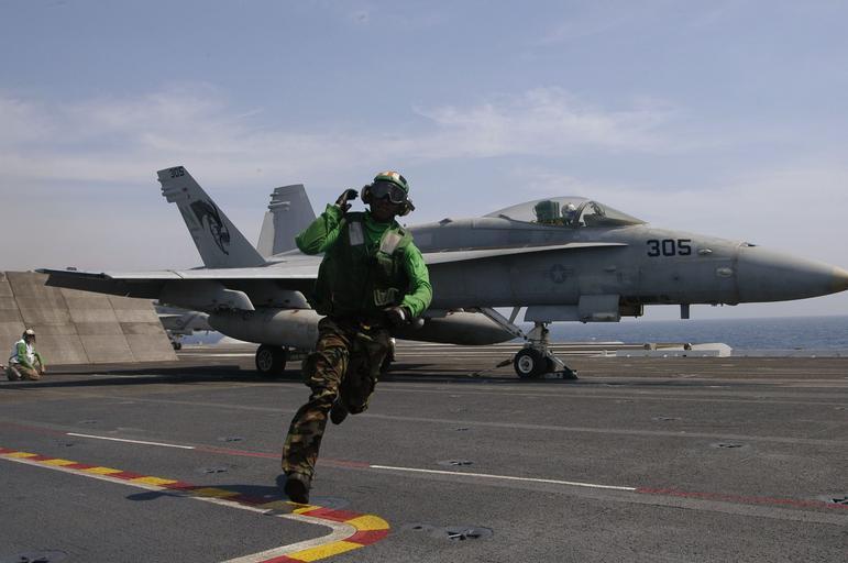 MAKE A MEME View Large Image Navy 040720-N-5781F-010 Aviation Boatswain's Mate 3rd Class Johnson Kyemanie from Grenada, Miss., runs to the foul line signaling the all clear for launch of an F-A-18C Hornet off the flight deck of USS Kitty Hawk (CV 63).jpg en Pacific ...