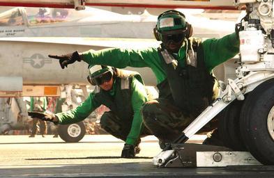 Keywords: US Navy 040803-N-0841E-081 Aviation Boatswain's Mate 3rd Class Jeffrey Bedsole from Redwood City, Calif., and Airman Mario Wright from Dayton, Ohio give the signal for the catapult shuttle to be moved forward to lock in the lau.jpg en Pacific Ocean Aug 3 2004 - Aviation Boatswain's Mate 3rd Class Jeffrey Bedsole from Redwood City Calif and Airman Mario Wright from Dayton Ohio give the signal for the catapult shuttle to be moved forward to lock in the launch bar of an aircraft on the flight deck of the aircraft carrier USS John C Stennis CVN 74 Stennis and Carrier Air Wing Fourteen CVW-14 are at sea participating in a scheduled deployment and supporting Summer Pulse 2004 which is the deployment of seven carrier strike groups CSGs demonstrating the ability of the Navy to provide credible combat capability across the globe in five theaters with other U S allied and coalition military forces Summer Pulse is the Navy's first deployment under its new Fleet Response Plan FRP U S Navy photo by Photographer's Mate 2nd Class Oscar Espinoza RELEASED For more information go to <a href http //www cffc navy mil/summerpulse04 htm Target _BLANK >www cffc navy mil/summerpulse04 htm</a> 2004-08-03 040803-N-0841E-081 Navy http //www navy mil/view_image asp id 16827 U S Navy photo by Photographer's Mate 2nd Class Oscar Espinoza PD-USGov-Military-Navy Aviation Boatswain's Mates Equipment Aboard USS John C Stennis CVN-74 |