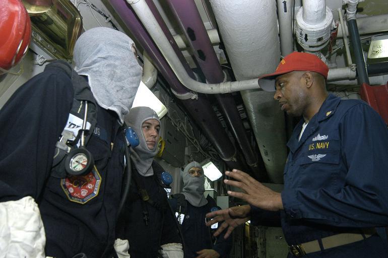 Keywords: US Navy 040813-N-4565G-001 Damage Control Training Team (DCCT) member Chief Storekeeper John Wynn from Atlanta, Ga., briefs boundary men during a General Quarters drill aboard the aircraft carrier USS John F Kennedy (CV 67).jpg en Arabian Gulf Aug 13 20004 - Damage Control Training Team DCCT member Chief Storekeeper John Wynn from Atlanta Ga briefs boundary men during a General Quarters drill aboard the aircraft carrier USS John F Kennedy CV 67 Kennedy and Carrier Air Wing Seventeen CVW-17 are on deployment and operating in the Middle East region as part of Operation Iraqi Freedom OIF Units in the Kennedy Carrier Strike Group are working closely with Multi-National Corps-Iraq and Iraqi forces to bring stability to the sovereign government of Iraq U S Navy photo by Photographer s Mate Airman Tommy Gilligan RELEASED Aug 13 20004 040813-N-4565G-001 Navy http //www navy mil/view_image asp id 17060 U S Navy photo by Photographer s Mate Airman Tommy Gilligan PD-USGov-Military-Navy Aboard USS John F Kennedy CV-67 |