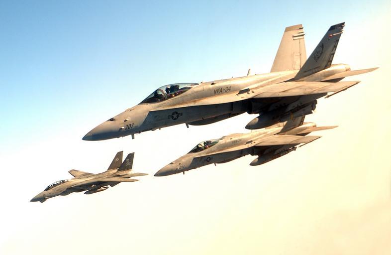 Keywords: US Navy 040814-F-6740T-124 A pair of F-A-18C Hornets and an F-14B Tomcat fly in loose formation over Iraq.jpg en Iraqi Air Space Aug 14 2004 - A pair of F/A-18C Hornets assigned to the Blue Blasters of Strike Fighter Squadron Three Four VFA-34 and an F-14B Tomcat assigned to the Jolly Rogers of Fighter Squadron One Zero Three VF-103 fly in loose formation over Iraq during a combat mission in support of Operation Iraqi Freedom OIF VFA-34 and VF-103 are currently assigned to Carrier Air Wing Seventeen CVW-17 embarked aboard the aircraft carrier USS John F Kennedy CV 67 U S Air Force photo by Staff Sgt Lee O Tucker RELEASED 2004-08-14 040814-F-6740T-124 Navy http //www navy mil/view_image asp id 17261 U S Navy photo PD-USGov-Military-Navy Aircraft formation flight of F-14B Tomcat Aerial photographs of F-14 Tomcat in flight F/A-18C Hornet in flight Strike Fighter Squadron 34 United States Navy Strike Fighter Squadron 103 United States Navy |
