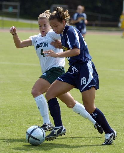 Keywords: US Navy 040829-N-9694M-002 U.S. Naval Academy Midshipman 3rd Class Meggie Curran races to keep the ball away from George Mason University's Danielle McDonald during a regular season soccer match.jpg en Fairfax Va Aug 29 2004 - U S Naval Academy Midshipman 3rd Class Meggie Curran races to keep the ball away from George Mason University's Danielle McDonald during a regular season soccer match Sophomore forward Meggie Curran from Silver Spring Md put the Mids on top in the 14th minute when rookie Kari Weniger St Petersburg Fla crossed the ball to Curran who fired in the shot to the lower left side of the net Two days after playing the eighth-ranked team in the country Connecticut the Navy women's soccer team 0-1-1 battled George Mason 1-0-1 to a 1-1 tie at George Mason Stadium in Fairfax Va U S Navy photo by Damon J Moritz RELEASED 2004-08-29 040829-N-9694M-002 Navy http //www navy mil/view_image asp id 17297 U S Navy photo by Damon J Moritz PD-USGov-Military-Navy Images from US Navy location FAIRFAX Va Association football in the United States George Mason University United States Naval Academy athletics Photos taken with Nikon D2H
