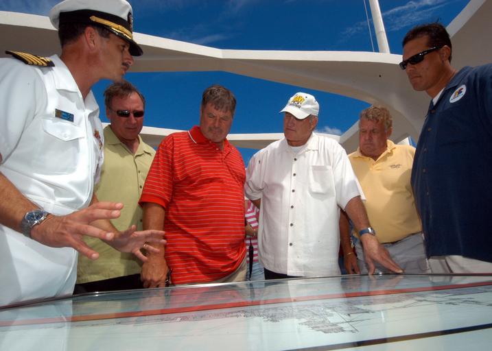 Keywords: US Navy 040902-N-3019M-004 Capt. Michael C. Vitale, commander, Navy Region Hawaii and commander, Naval Surface Group Middle Pacific, explains the events surrounding the attack on Pearl Harbor to National Football League (NFL) H.jpg en Pearl Harbor Hawaii Sept 2 2004 - Capt Michael C Vitale commander Navy Region Hawaii and commander Naval Surface Group Middle Pacific explains the events surrounding the attack on Pearl Harbor to National Football League NFL Hall of Fame quarterback Terry Bradshaw at the USS Arizona Memorial Bradshaw along with Armando Fitz from the Navy NASCAR team received a barge tour of Pearl Harbor and USS Arizona Memorial conducted by Capt Michael C Vitale Bradshaw and Fitz were at Pearl Harbor to attend the 59th anniversary of the end of World War II held on the decommissioned battleship USS Missouri U S Navy photo by Journalist Seaman Ryan C McGinley RELEASED 2004-09-02 040902-N-3019M-004 Navy http //www navy mil/view_image asp id 17405 U S Navy photo by Journalist Seaman Ryan C McGinley PD-USGov-Military-Navy USS Arizona Memorial interior Michael C Vitale Terry Bradshaw Armando Fitz |