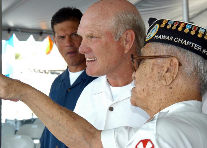 Keywords: US Navy 040902-N-3019M-002 National Football League (NFL) Hall of Fame quarterback Terry Bradshaw listens to a Pearl Harbor survivor as he describes his experiences aboard USS Missouri.jpg en Pearl Harbor Hawaii Sept 2 2004 National Football League NFL Hall of Fame quarterback Terry Bradshaw listens to a Pearl Harbor survivor as he describes his experiences aboard USS Missouri Bradshaw along with Armando Fitz from the Navy NASCAR team received a barge tour of Pearl Harbor and USS Arizona Memorial conducted by Capt Michael C Vitale commander Navy Region Hawaii and commander Naval Surface Group Middle Pacific Bradshaw and Fitz were at Pearl Harbor to attend the 59th anniversary of the end of World War II held on the decommissioned battleship USS Missouri U S Navy photo by Journalist Seaman Ryan C McGinley RELEASED 2004-09-02 040902-N-3019M-002 Navy http //www navy mil/view_image asp id 17403 U S Navy photo by Journalist Seaman Ryan C McGinley PD-USGov-Military-Navy Battleship Missouri Memorial Armando Fitz Terry Bradshaw |