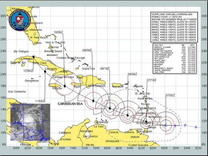 | Keywords: US Navy 040907-N-0000X-001 Current forecast projected path and wind speeds of Hurricane Ivan from Sept 7 to Sept 12.jpg en Mid-Atlantic Ocean Sept 7 2004 - Current forecast projected path and wind speeds of Hurricane Ivan from Sept 7 to Sept 12 Ivan a category three hurricane on the Saffir-Simpson hurricane scale is approximately 45 miles Northeast of Tobago moving at near 18 MPH Maximum sustained winds remain near 115 MPH with winds extending outwards up to 70 miles The storm is expected to gradually turn toward the west-northwest later Tuesday Forecasters said Ivan is the strongest hurricane to develop at such a low latitude in recorded Atlantic hurricane history Photo provided by Naval Atlantic Meteorology and Oceanography Center RELEASED For more information visit <a href https //weather navy mil Target _BLANK >https //weather navy mil</a> 2004-09-07 040907-N-0000X-001 Navy http //www navy mil/view_image asp id 17497 U S Navy photo PD-USGov-Military-Navy Satellite pictures of Hurricane Frances TRMM |