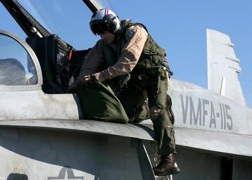 | Keywords: US Navy 041125-N-5345W-026 U.S. Marine Corps Maj. Rhett Lawing performs a pre-flight check before climbing into the cockpit.jpg en Persian Gulf Nov 25 2004 U S Marine Corps Maj Rhett Lawing assigned to the Silver Eagles of Marine Fighter Attack Squadron One One Five VMFA-115 performs a pre-flight check before climbing into the cockpit of his F/A-18A Hornet to participate in combat sorties from the Nimitz-class aircraft carrier USS Harry S Truman CVN 75 Truman's Carrier Strike Group Ten CSG-10 and her embarked Carrier Air Wing Three CVW-3 are currently on a scheduled deployment in support of the Global War on Terrorism U S Navy photo by Photographer s Mate Airman Kristopher Wilson RELEASED 2004-11-25 041125-N-5345W-026 Navy http //www navy mil/view_image asp id 19255 U S Navy photo by Photographer s Mate Airman Kristopher Wilson PD-USGov-Military-Navy Aboard USS Harry S Truman CVN-75 Pre-flight checks USMC |